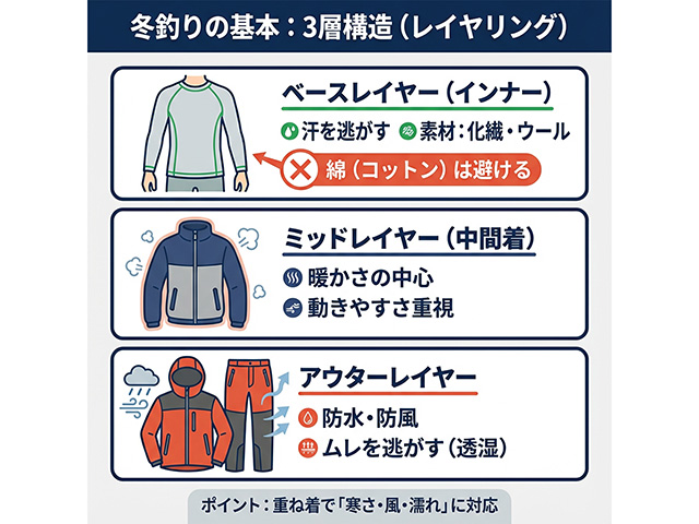 冬釣りにおける服装の基本は、「3層構造(レイヤリング)」です。