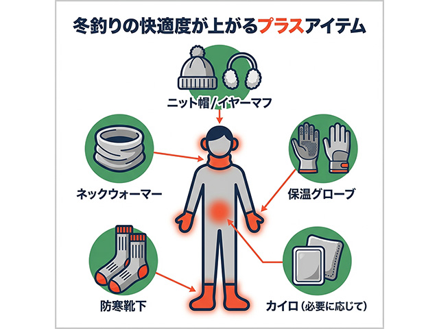 釣り用防寒ウェアだけではカバーしきれない部分もあります。