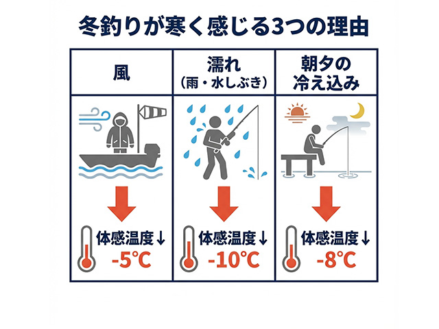 冬の釣りでは、気温が低く、よく釣れる時間帯である早朝や夕方以降は特に冷え込みやすいのが特徴です。
